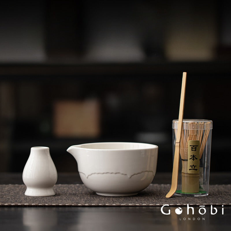 Experience traditional tea ceremonies with the Gohobi Ceramic Matcha Set 111 crafted in the style of Song Dynasty, this set includes a petal-colored tea bowl and all the tools needed for a proper tea order. Made of high-quality ceramic, it's a beautiful addition to any household.