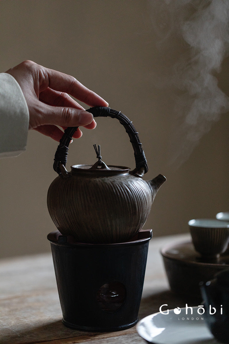 The Gohobi Japanese Pottery Rattan-Woven Teapot is a handcrafted ceramic kettle inspired by traditional Japanese tea aesthetics and charcoal stove brewing.