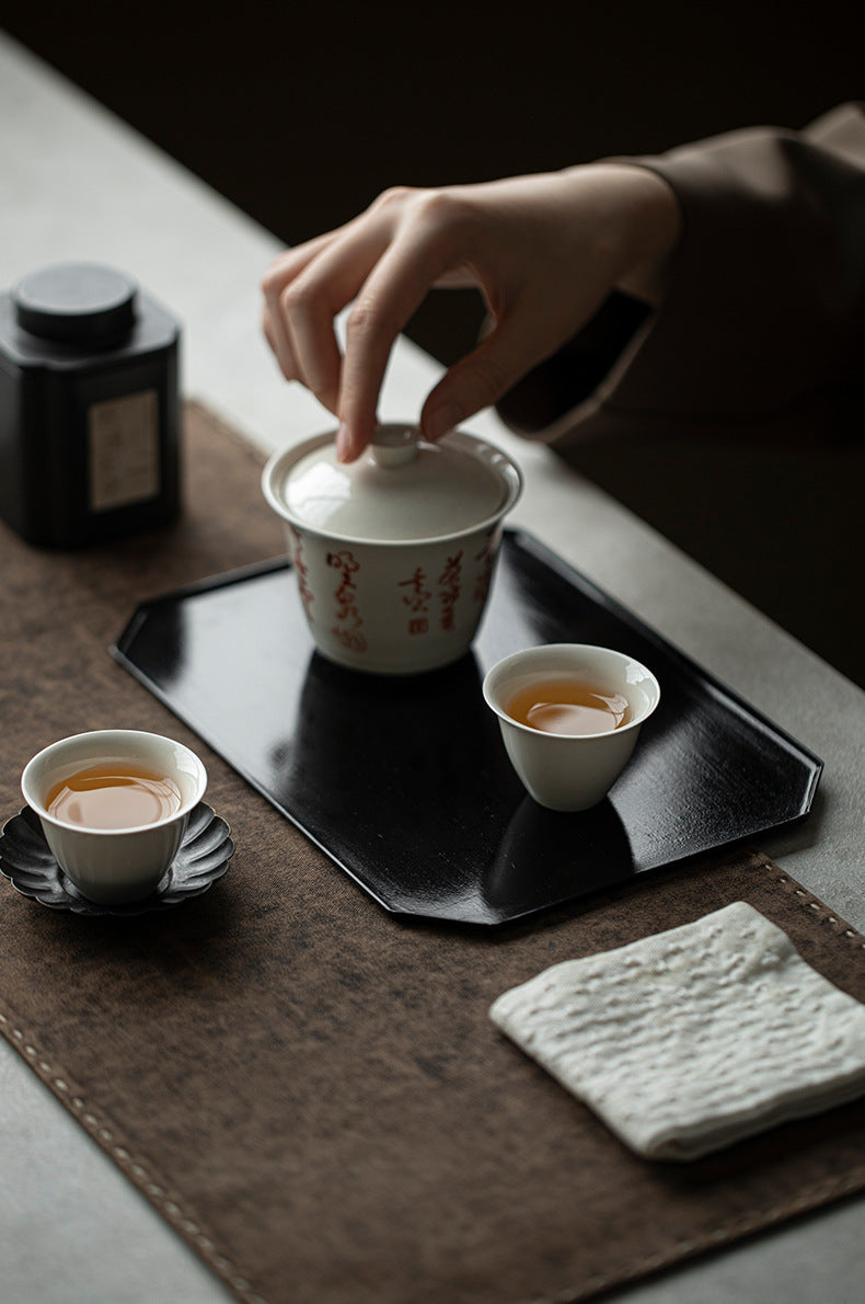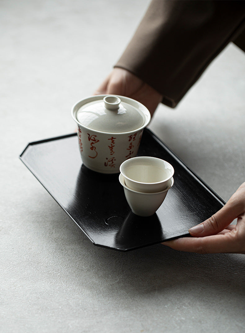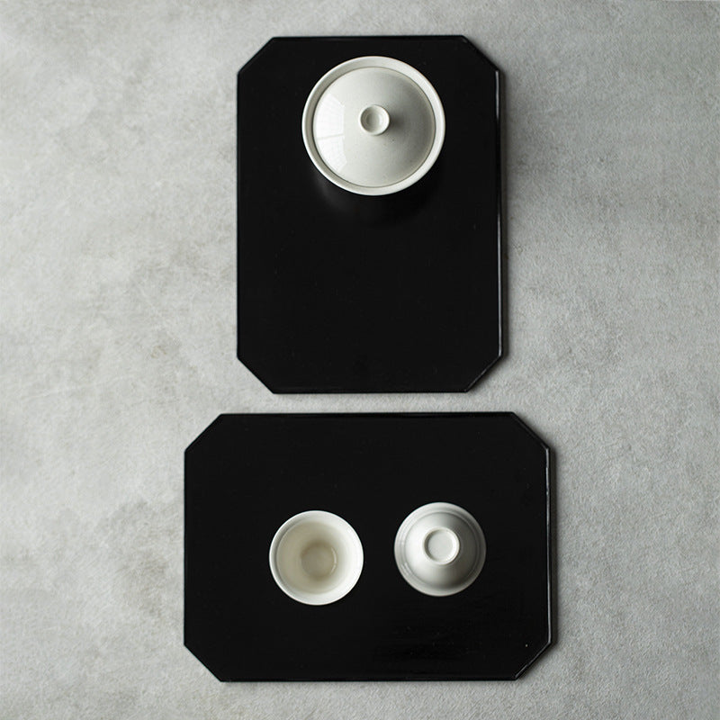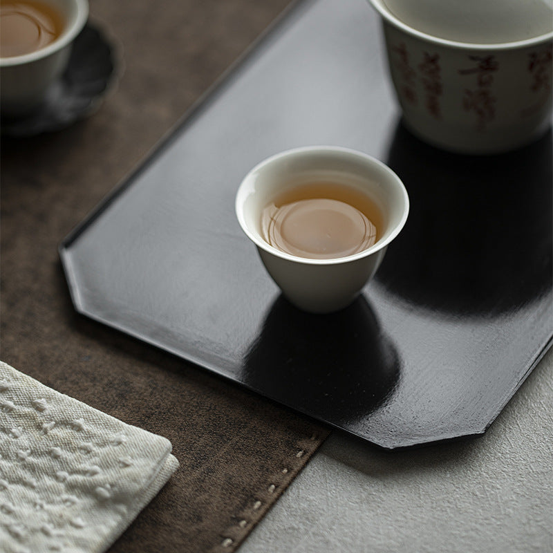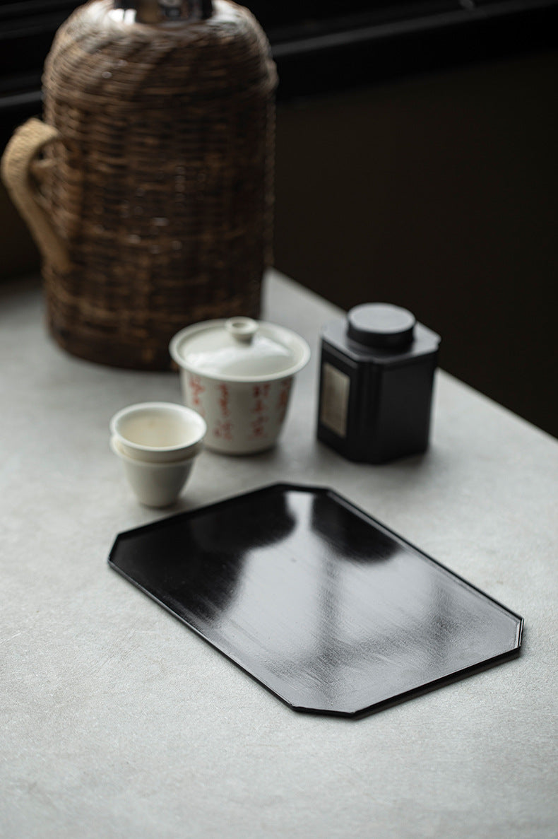 Plateau compact en fer de style japonais mesurant environ 22 x 16 cm. Il présente une esthétique Wabi-Sabi traditionnelle et une finition laquée noire durable. Idéal pour le service à thé ou comme objet décoratif.