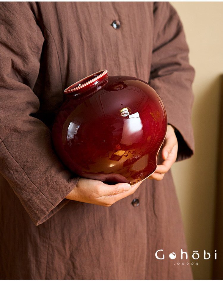 Bring a bold and elegant accent to your home with this Gohobi Jingdezhen Lang Hong ceramic vase. Inspired by the New Chinese style and traditional porcelain techniques, this large round vase features the rich Lang Hong red glaze, known for its deep and vibrant colour.