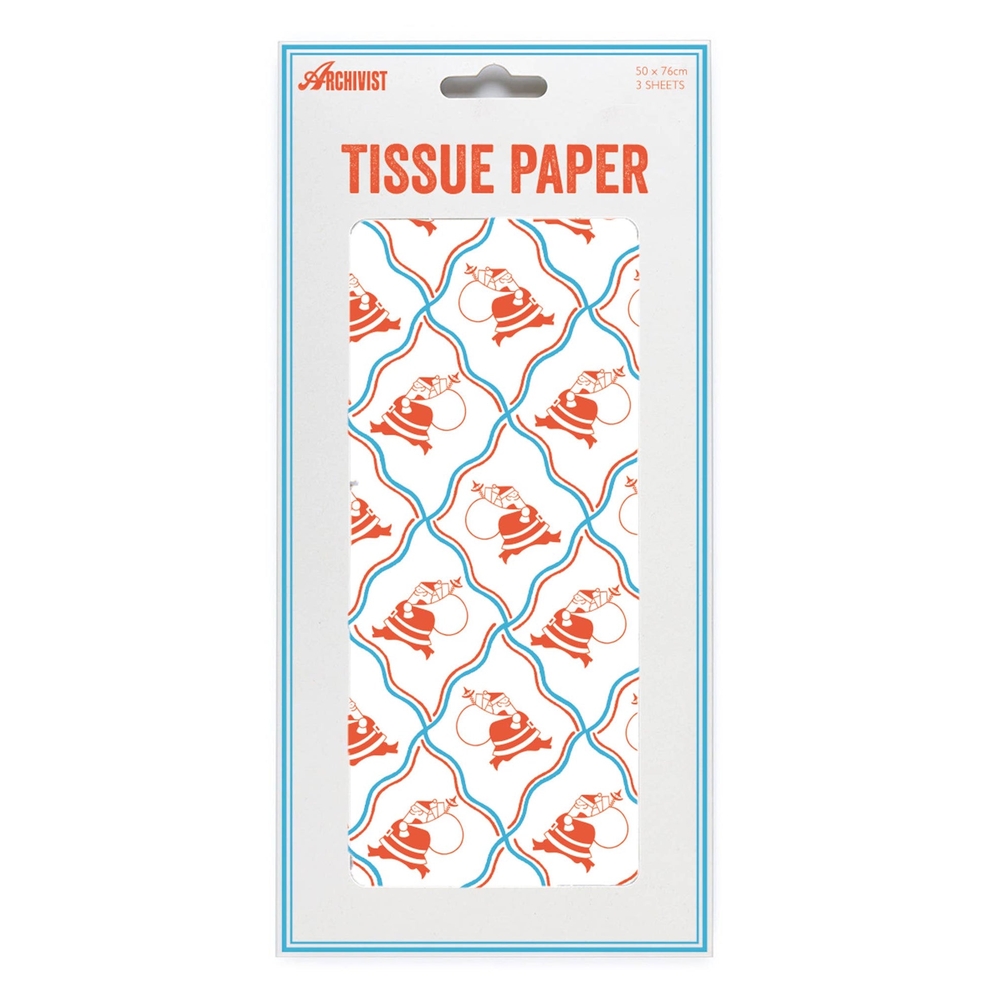 Our tissue paper wrap featuring jolly Santas with a sack of gifts slung over his shoulder, each Santa is separated with wavy red and blue lines.